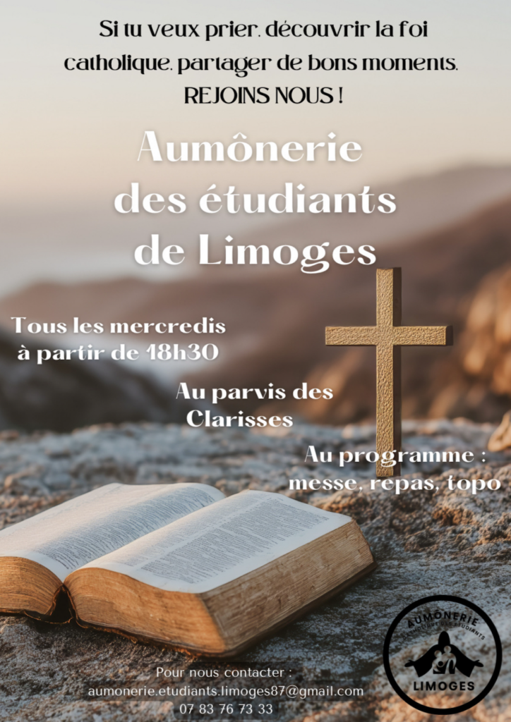 Si tu veux prier, découvrir la foi catholique et partager, Rejoins l’aumônerie de Limoges au Parvis des Clarisses, tous les mercredis à partir de 18h30 !