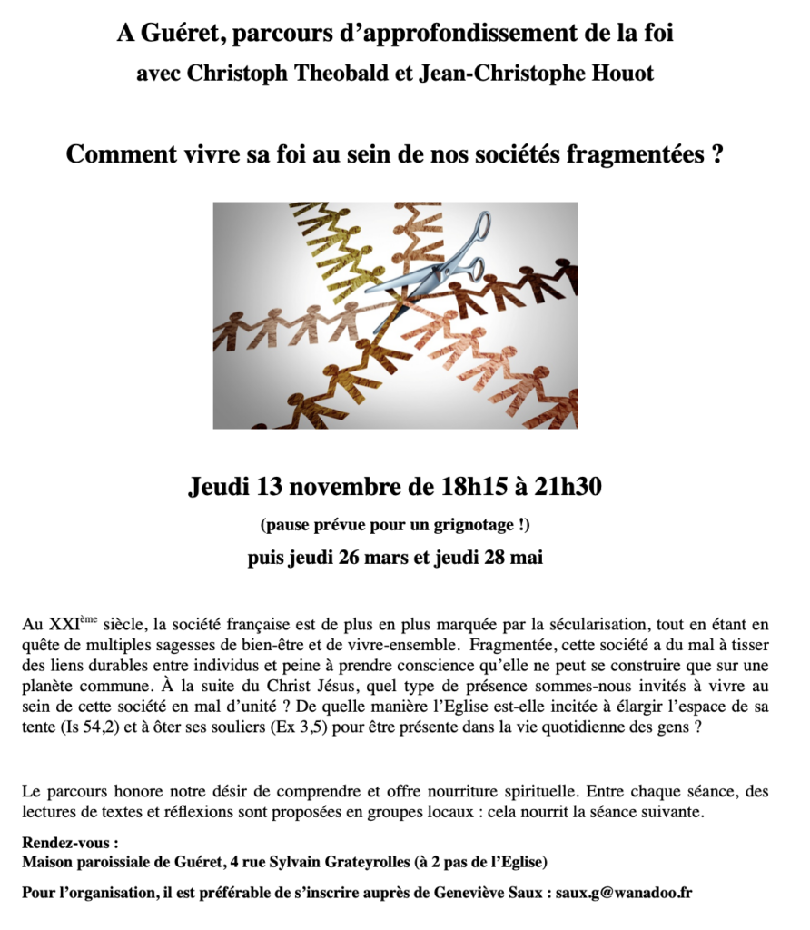 Comment vivre se foi au sein de nos sociétés fragmentées ? Changer de paroisse Diocèse de Limoges Actualités Comment vivre se foi au sein de nos sociétés fragmentées ? Comment vivre se foi au sein de nos sociétés fragmentées ? Diocèse Partager l'article Sur Facebook Sur Twitter Sur Linkedin Par Email Publié le 6 novembre 2025