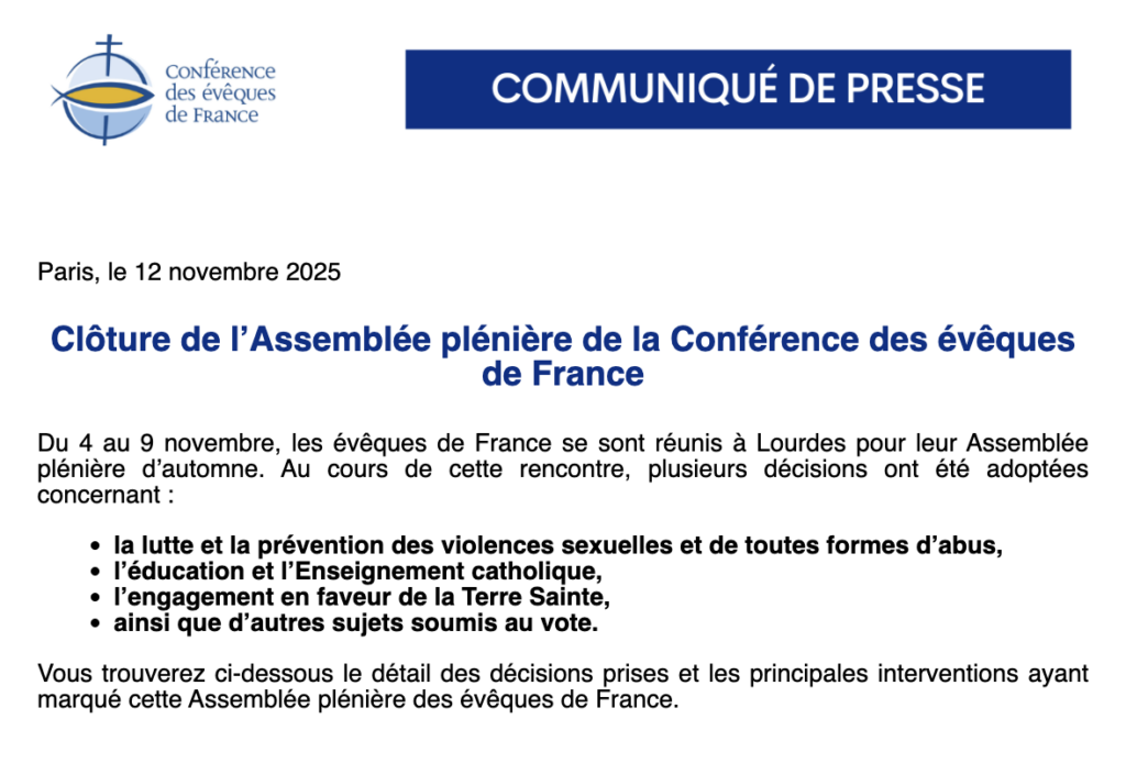 La Conférence des évêques de France annonce la clôture de son Assemblée plénière d’automne, tenue à Lourdes du 4 au 9 novembre 2025. Les évêques ont travaillé sur plusieurs thèmes majeurs. Plus d’informations sur leur site internet via les liens ci-dessous !