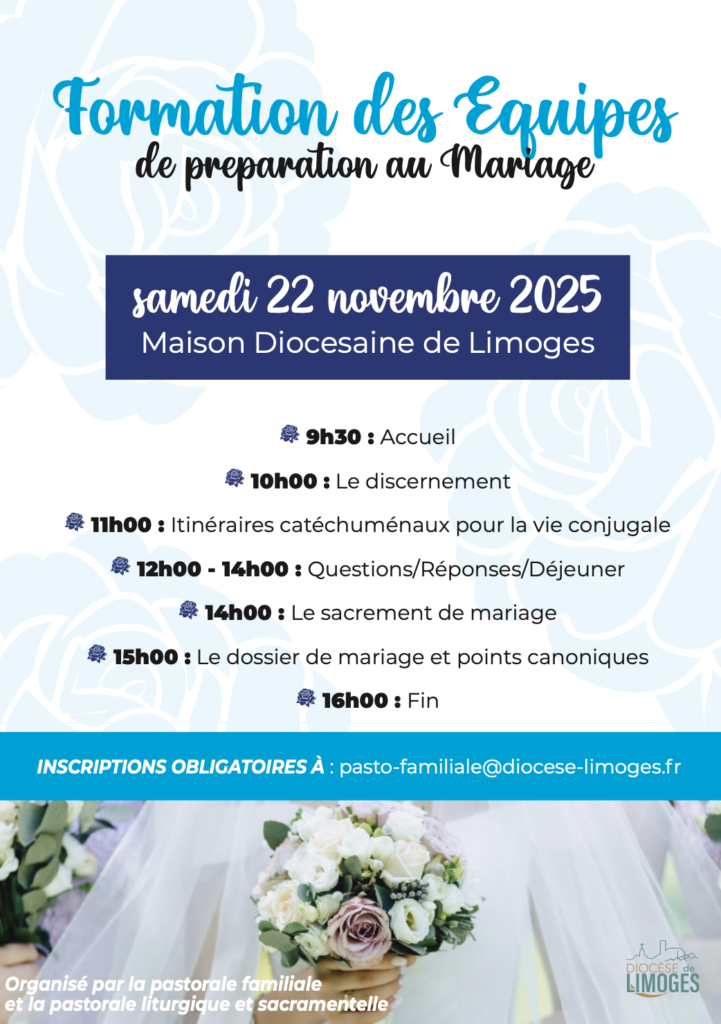 La journée de formation des équipes de préparation au mariage aura lieu le samedi 22 novembre dans la maison diocésaine ! L’accueil est prévu à 9h, inscrivez-vous dès maintenant à « pasto-familiale@diocese-limoges.fr » !