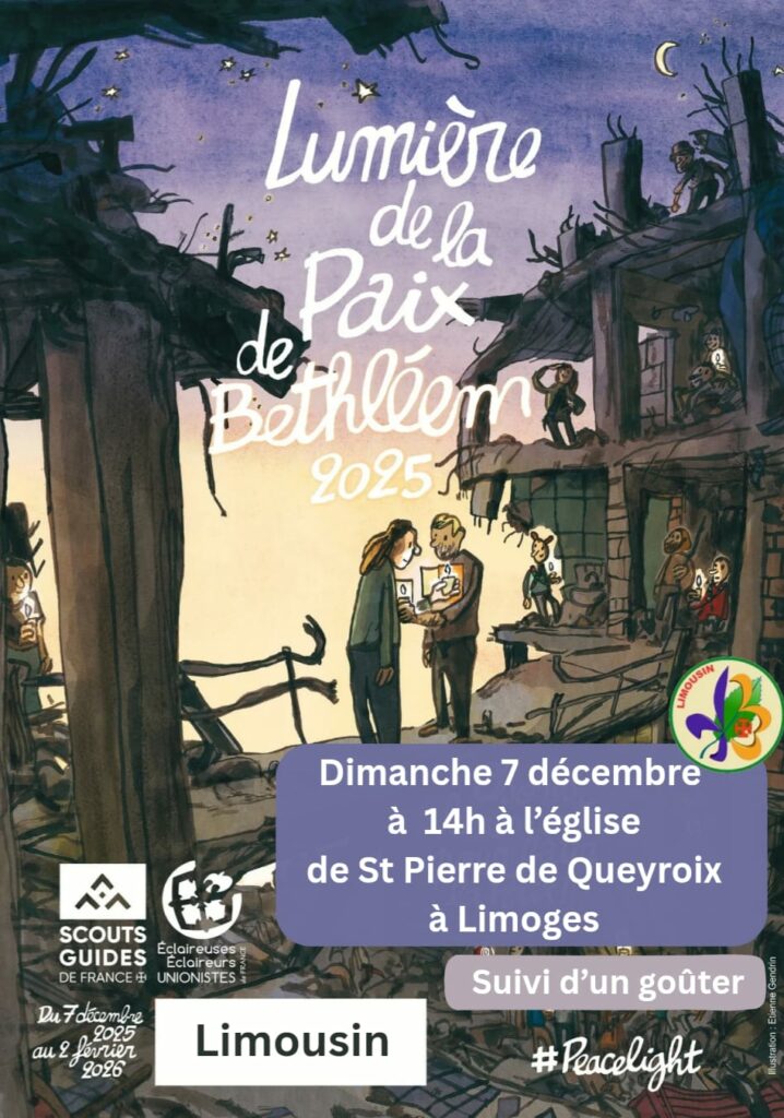 Cette année les scouts et guides de France du Limousin invitent chacun à recevoir la lumière de la paix de Bethléem. Une célébration œcuménique se déroulera à l’église Saint Pierre du Queyroix à Limoges dimanche 7 décembre de 14h00 à 15h00. N’hésitez pas à vous joindre à nous !