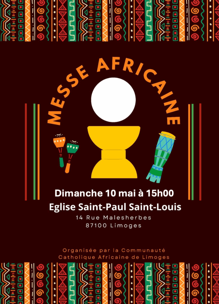 Une « messe africaine » sera proposée le dimanche 10 mai 2026, à 15h, en l’église Saint-Paul Saint-Louis à Limoges. Retrouvez toutes les informations ci-dessous :