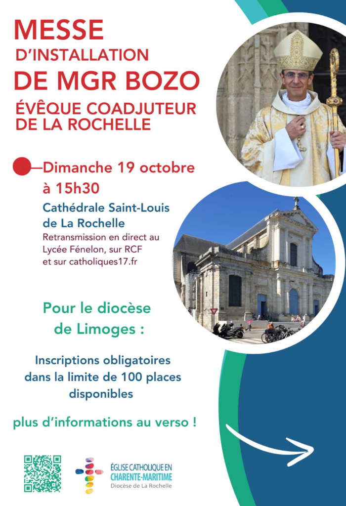 La messe d’installation de Mgr Bozo dans la cathédrale Saint-Louis de La Rochelle aura lieu le dimanche 19 octobre à 15h30. Elle sera retransmise en direct au Lycée Fénelon, sur RCF et sur catholiques17.fr