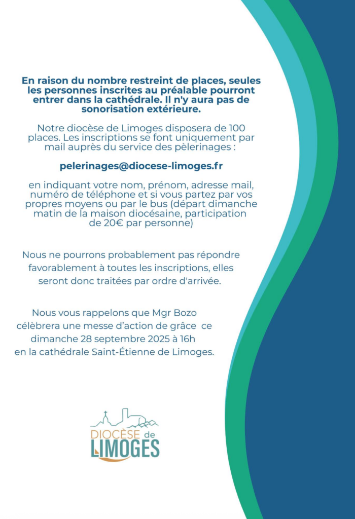 Le diocèse de Limoges disposera de 100 places. Les inscriptions se font uniquement par mail auprès du service des pèlerinages : « pelerinages@diocese-limoges.fr » !
