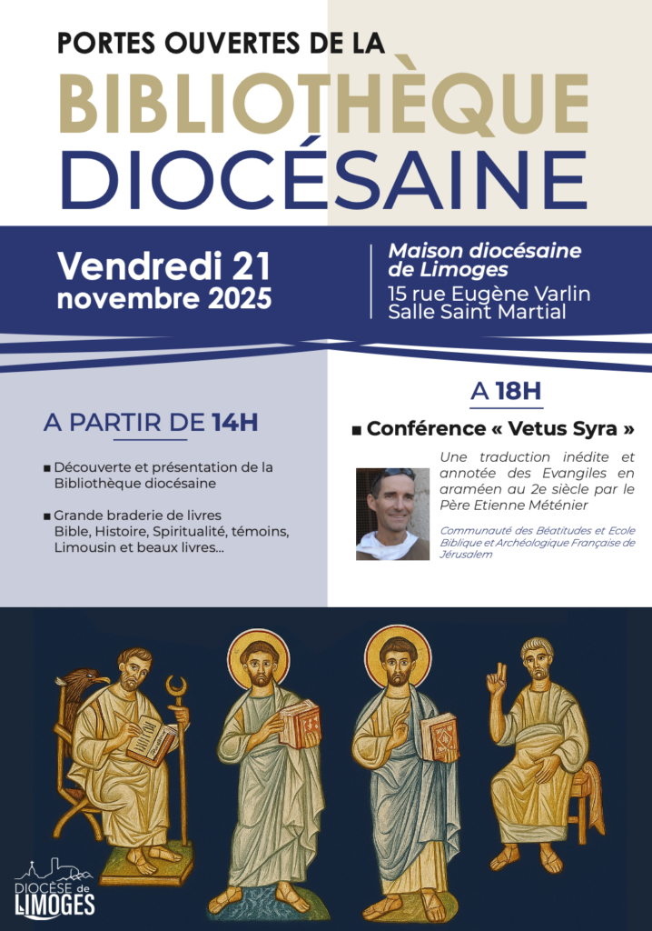 La bibliothèque diocésaine ouvre ses portes le vendredi 21 novembre à partir de 14h ! Retrouvez le programme de la journée dès maintenant ! Rendez-vous dans la salle Saint-Martial de la maison diocésaine !