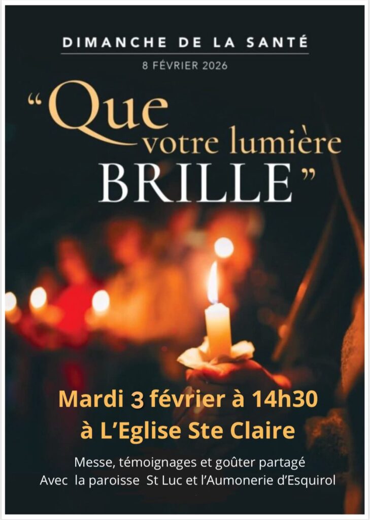 Le mardi 3 février à 14h30 à l’Église Sainte Claire, une messe des témoignages et un goûter partagé avec la paroisse St Luc ainsi que l’Aumônerie d’Esquirol seront proposé ! Nous vous attendons nombreux sur place !