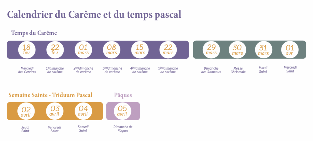 Le Carême est un temps liturgique de 40 jours par lequel l’Église se prépare à célébrer Pâques. Il commence le Mercredi des Cendres, cette année le mercredi 18 février, et se termine le Jeudi saint, là encore cette année le jeudi 2 avril. Démarre ensuite le triduum pascal, c’est-à-dire 3 jours pendant lesquels nous célébrons la Passion, la mort et la résurrection