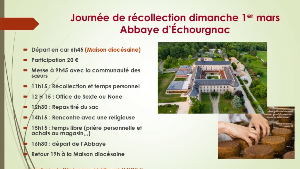 Les équipes pastorales de l’Arc Nord vous proposent une journée de récollection à l’Abbaye d’Échourgnac le dimanche 1er mars 2026. le transport se fera en car pour ceux qui le souhaitent et il est impératif de s’inscrire avant le 21 février avec le bulletin d’inscription ci-dessous.