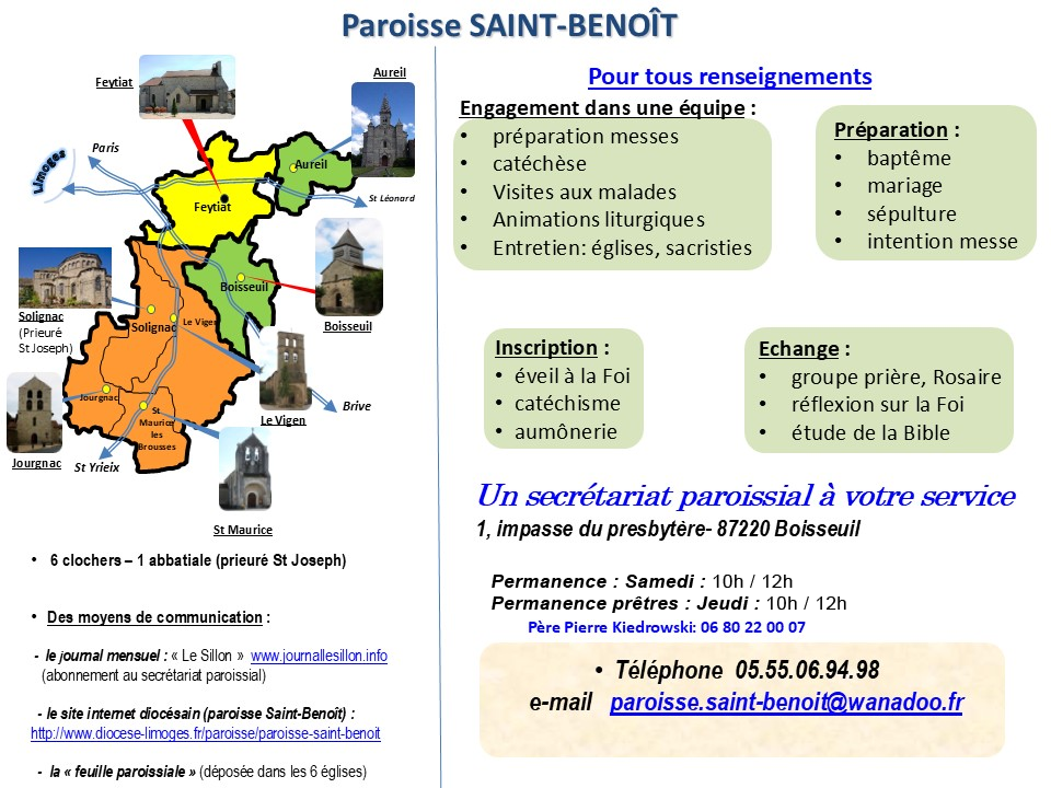 Site paroissial d’information des communes d’Aureil, Boisseuil, Feytiat, Jourgnac, Le Vigen, Saint-Maurice-les-Brousses et Solignac. Créée à la suite du synode de Limoges en 1995, la Paroisse Saint-Benoît appartient au diocèse de Limoges, dans le doyenné du « Grand Limoges ». Les 15.200 habitants de cette zone péri-urbaine constituent essentiellement une population de familles jeunes, travaillant sur Limoges. Saint-Benoît est jumelée avec la paroisse de Kongoussi, au Burkina Fasso. Son organisation et le dynamisme de ses membres font de Saint-Benoît une paroisse ouverte sur le monde, dynamique et accueillante.