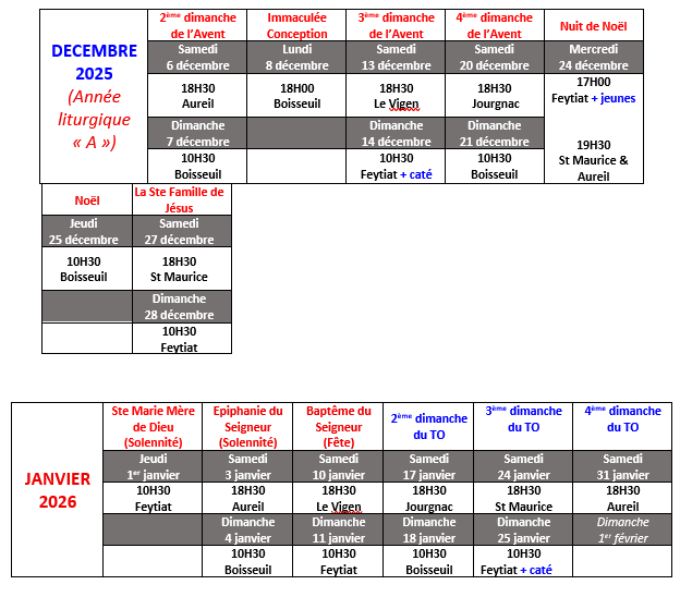 Calendrier des messes 2025/2026