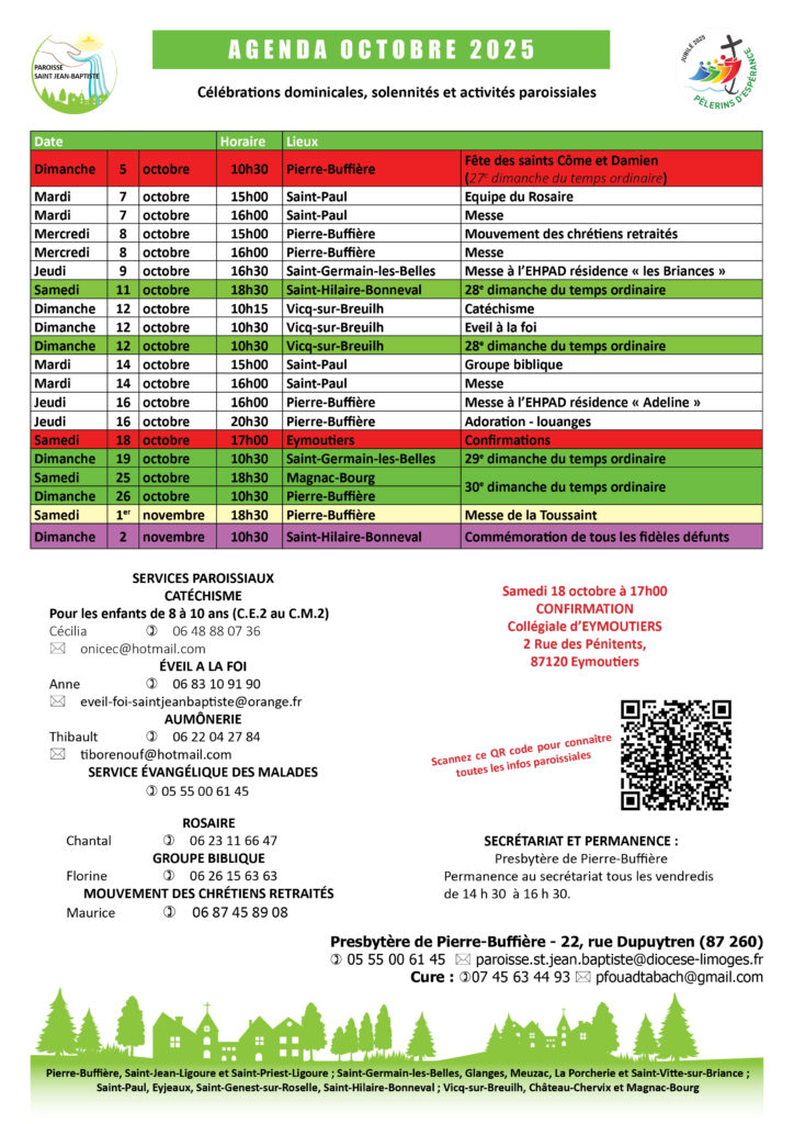 Agenda du mois d’octobre 2025 Changer de paroisse Diocèse de Limoges Doyennés de Haute-Vienne Actualités Agenda du mois d’octobre 2025 Agenda du mois d’octobre 2025 Paroisse Saint Jean-Baptiste Partager l'article Sur Facebook Sur Twitter Sur Linkedin Par Email Publié le 1 octobre 2025