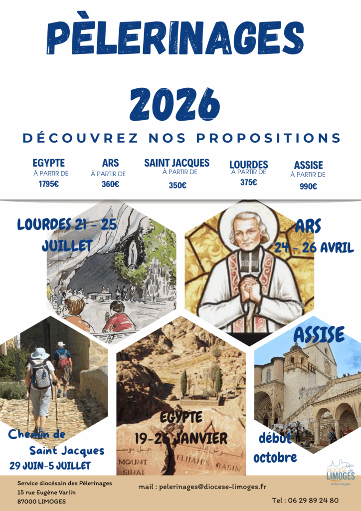 Notre messagerie pelerinages@diocese-limoges.fr est lue régulièrement. N’hésitez pas à nous contacter pour vous inscrire sur nos propositions. Vous pouvez aussi cliquer sur l’affiche de votre choix. Vous serez orientés vers la page concernant ce pèlerinage.