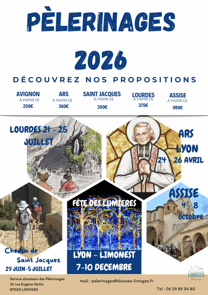 Notre messagerie pelerinages@diocese-limoges.fr est lue régulièrement. N’hésitez pas à nous contacter pour vous inscrire sur nos propositions. Vous pouvez aussi cliquer sur l’affiche de votre choix. Vous serez orientés vers la page concernant ce pèlerinage.