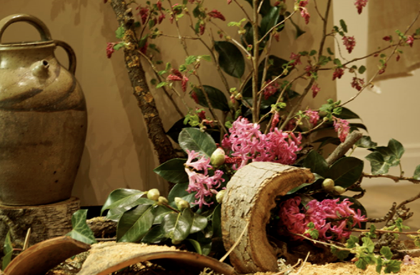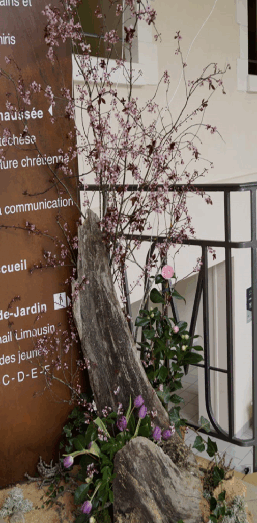 | En ce dimanche, nous approchons de la fête de Pâques. Les éléments précédents fanés sont enlevés pour les remplacer par des fleurs de dégradé de rose, couleur liturgique du 4ème dimanche de la joie (camélia, primevères, jacinthes …). A la base de la composition, nous plaçons des fleurs d’un rose plus soutenu. En hauteur, s’élèvent des branches d’un rose plus pâle (ex : cognassier ou prunus) La composition peut être enrichie de feuillages plus soutenus (ex-feuilles de bergenia, laurier, ou laurier-tin, fusain) |