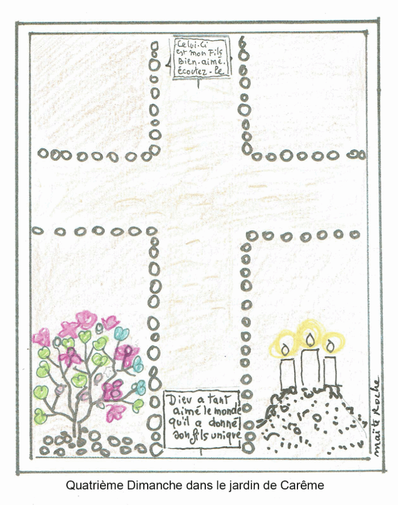 | Quelques conseils suggérés par Maïte Roche dans son croquis : – Comme tu l’as fait pour le 2ème dimanche de Carême, prépare une petite pancarte, tu as besoin : * d’une carte en proportion de ton jardin * écris : « Dieu a tant aimé le monde qu’il a donné son Fils unique » * tu peux utiliser un support ou une pique sur laquelle tu colleras l’étiquette – En bas à gauche, prépare des fleurs en papier. Utilise des papiers de différentes couleurs. Sans oublier les couleurs liturgiques, le violet, signe de l’attente, de la préparation et de la conversion, ni le rose de ce dimanche de la joie. Les couleurs des fleurs évoquent le sourire, la tendresse que tu donnes. Nous sommes joyeux car la lumière de Pâques est proche. – prépare le sol de chaque carré en vue des éléments qui seront apportés la semaine prochaine (un peu de terre) |
