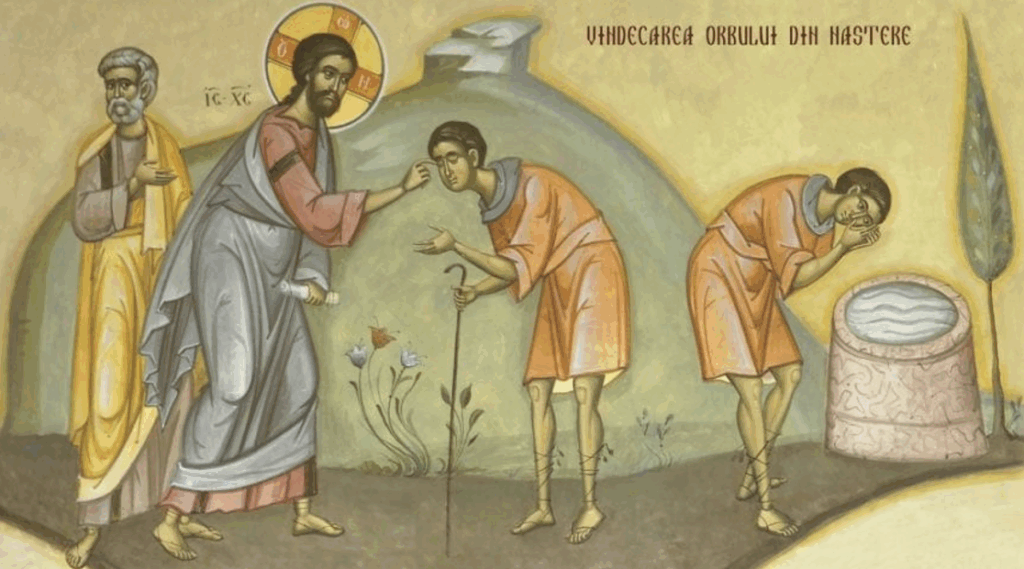 Deux miracles ont lieu en ce jour : la vue corporelle accordée à celui qui n’a jamais vu ; la vue charismatique accordée par le Verbe qui veut être connu de l’homme. Le Verbe coopère avec le saint Esprit qui descendra à la Pentecôte pour que nous puissions reconnaître en Jésus le Fils de l’Homme et le Fils de Dieu : admirable est cette réciprocité continuelle des « deux mains du Père » pour le Salut des hommes. L’épisode de ce jour enseigne ce qui est le but de l’immersion dans l’eau baptismale : voir le Verbe incarné, par la puissance et la chrismation du saint Esprit.