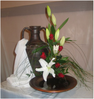 | L’installation de ton jardin va accompagner ta prière vers Pâques. Aujourd’hui, au centre de la croix, tu installes des éléments pour symboliser les gestes de Jésus : le linge et la cruche d’eau (le lavement des pieds), le pain rompu et la coupe (la Cène) , tu recherches des petits jouets, ou tu fabriques avec du papier, de la pâte à modeler les éléments dont tu auras besoin. Tu installes sur le côté gauche : le linge et la cruche, au centre de la croix : une table ou une nappe, un morceau de pain, une coupe. |